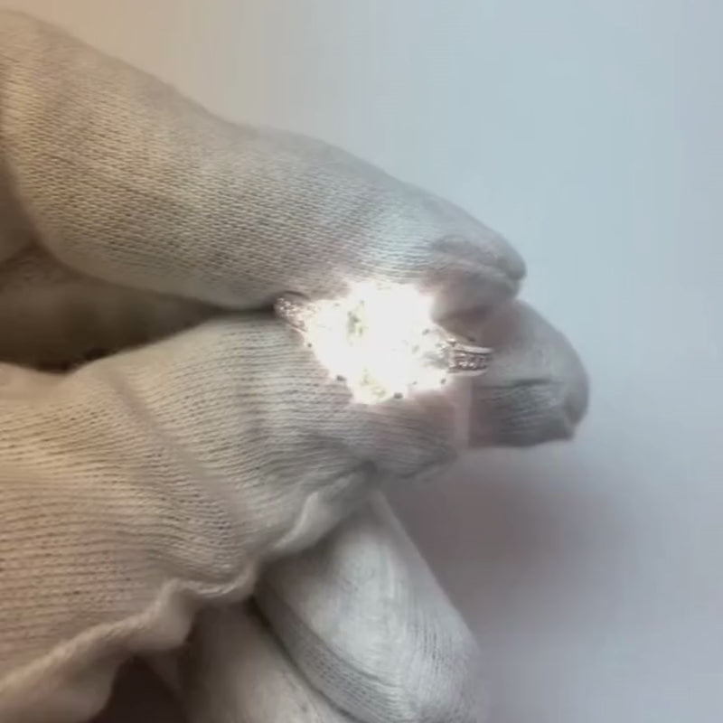 Steindetails: Es gibt einen zentralen ovalen Stein von ca. 2 Karat (ca. Größe 8,3 x 6,3 mm), 2 Halbmonddiamanten an den Seiten ca. 1 Karat und kleinere runde Diamanten an den Seiten ca. 0,50 Karat. Natürliche Diamanten aus Erdminen.
