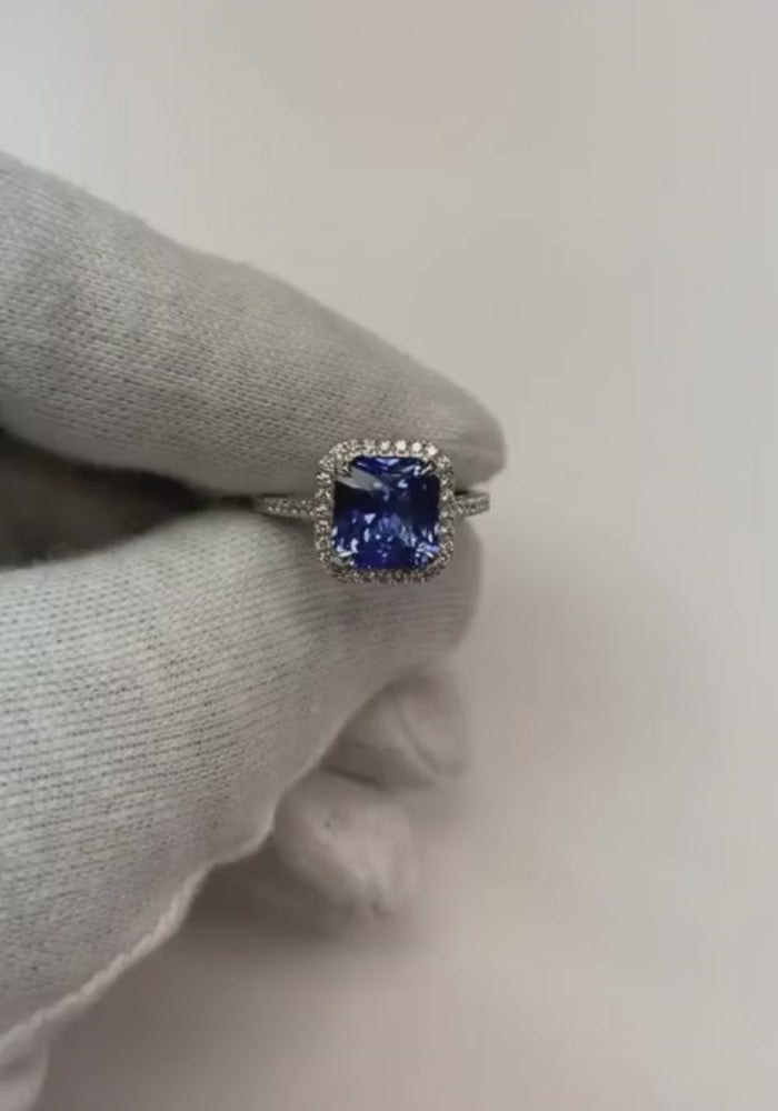 Steindetails: Es gibt einen strahlenden Schliff Saphir ca. 3,50 Karat (ca. Größe 9 x 7 mm) und ca. 1,50 Karat Diamanten an den Seiten. Natürliche, aus der Erde gewonnene Steine.