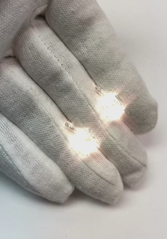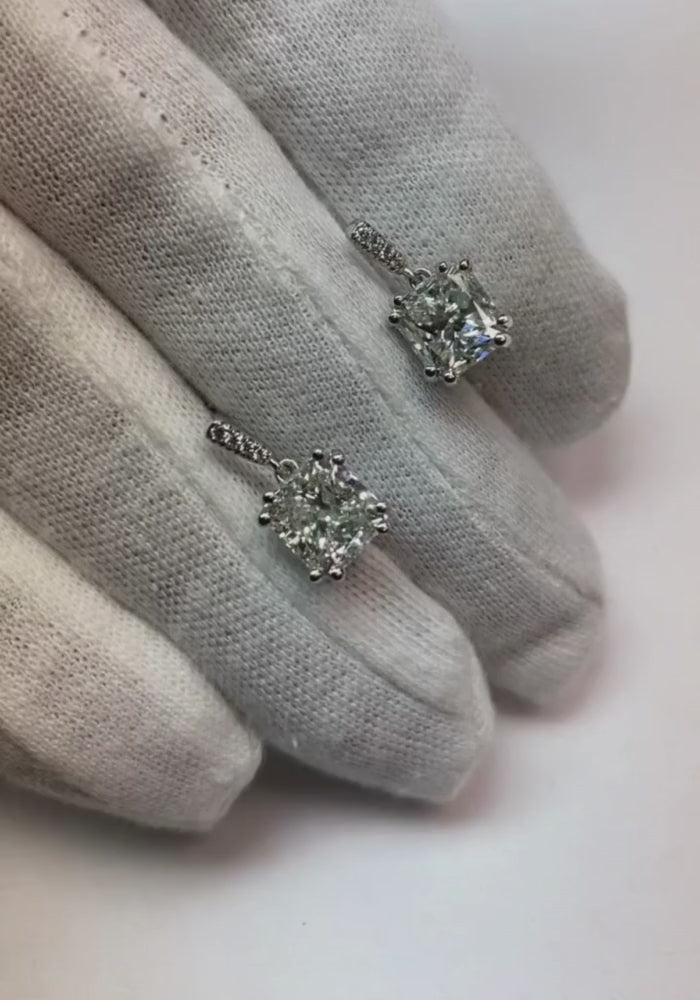 Details zum Stein: Es gibt einen alten Minendiamanten im Kissenschliff von ca. 3 Karat (ca. Größe 7 x 7 mm) und ca. 0,25 Karat kleinere Diamanten in jedem Ohrring. Natürliche Diamanten aus Erdminen.