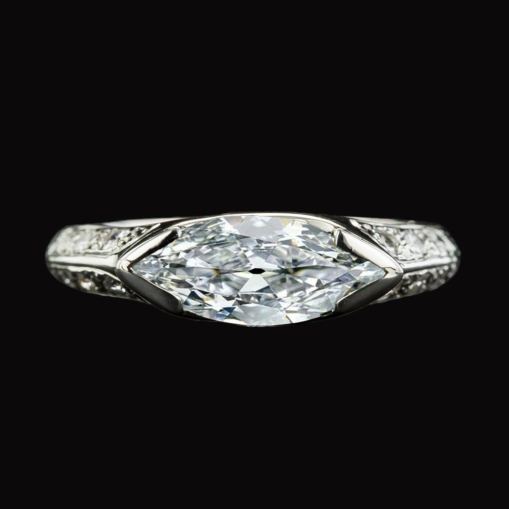 Steindetails: Es gibt einen alten Bergmann im Marquiseschliff Diamant ca. 4,50 Karat (ca. Größe 13 x 8 mm) und ca. 1,25 Karat kleinere Diamanten an den Seiten. Diamanten aus natürlicher Erde.