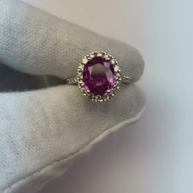 Steindetails: Dieser wunderschöne Halo-Ring hat einen oval geschliffenen rosafarbenen Saphir in der Mitte, ca. 3,75 Karat (ca. Größe 11,4 x 7,4 mm) mit ca. 1 Karat runde Diamanten an den Seiten. Entworfen mit natürlichen Erdsteinen.