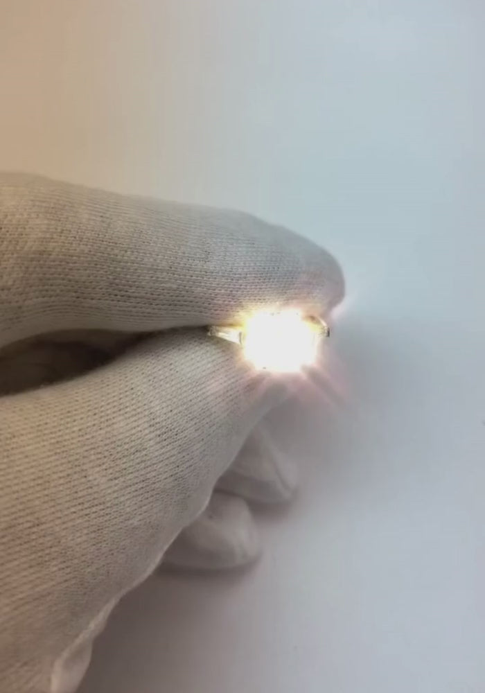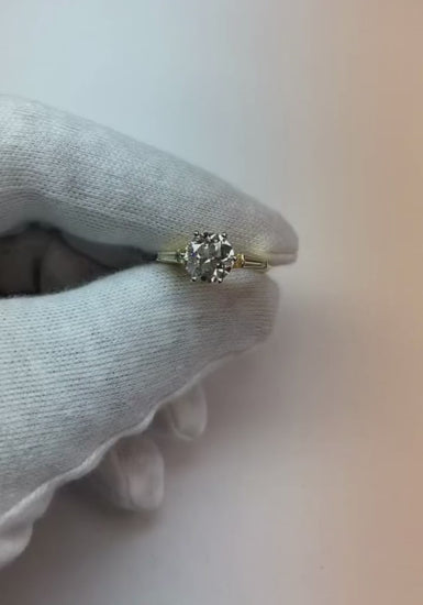 Steindetails: Es gibt einen alten Rundschliff Bergmannsdiamant ca. 2 Karat (ca. Ø 7,7 mm) und zwei Baguette-Diamanten ca. je 0,25 Karat (ca. Größe 4,7 x 2,2 mm) an den Seiten. Diamanten aus natürlicher Erde.