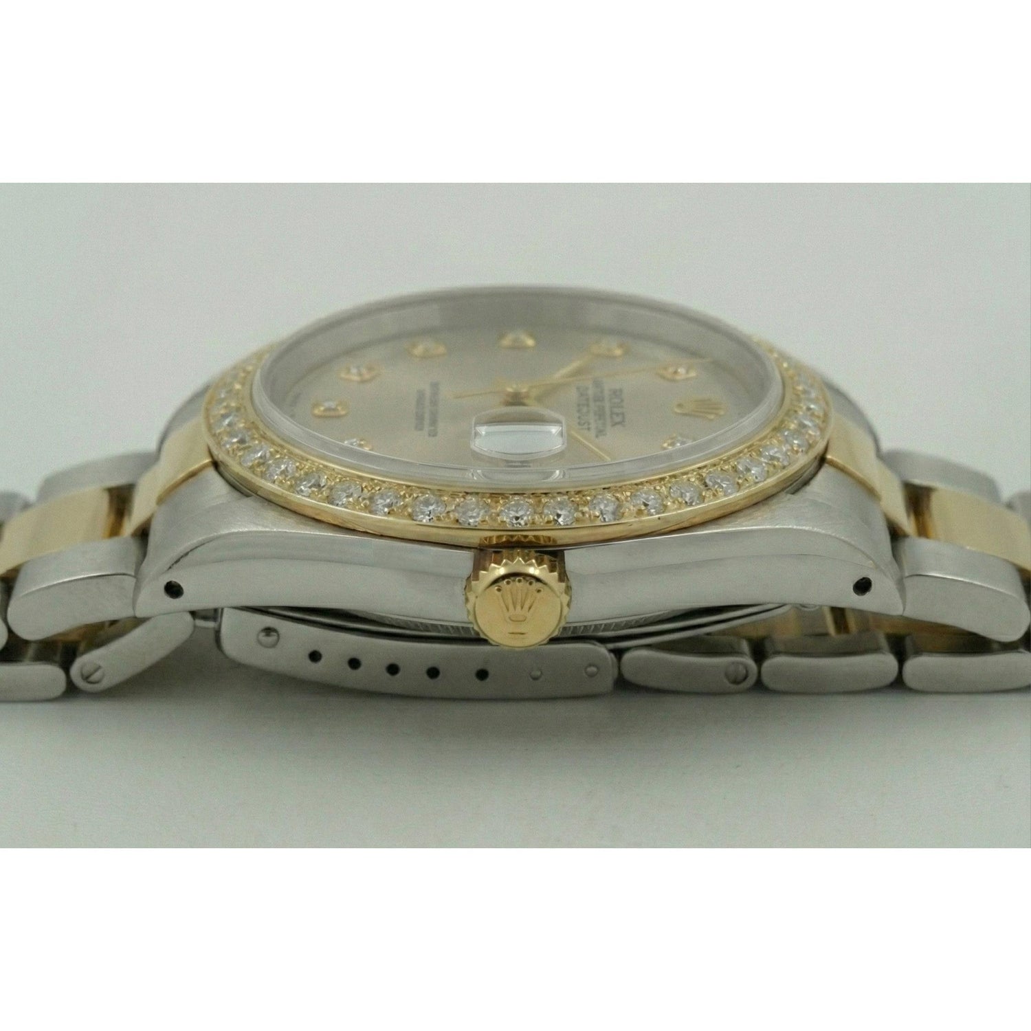 Rolex Oyster Perpetual Datejust-Modell. Silbernes Zifferblatt mit Diamantmarkierungen. Lünette aus 18-karätigem Gelbgold mit Perlenbesatz, ca. 1 Karat Diamanten von sehr feiner Qualität F VS1. Zweifarbiges Oyster-Armband.